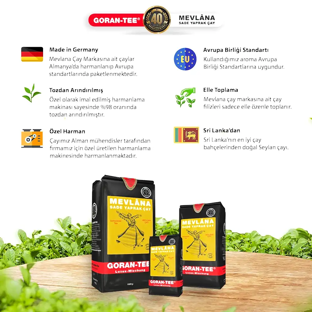 Goran Çayı tarafından üretilen Mevlana Siyah Seylan Çayı, Doğu Asya’nın yüksek rakımlı çay bahçelerinden gelir. Büyük aralıklı çay burada düzenlenir ve elle düzenlenir ve sıkı kalite standartlarına göre işlenir. Doğru yetiştirme yöntemi ve uygun iklim, olağanüstü kalite ve aromatik tat deneyimi için çok önemlidir.