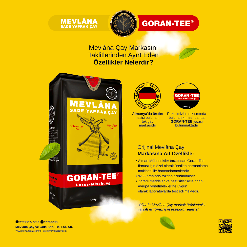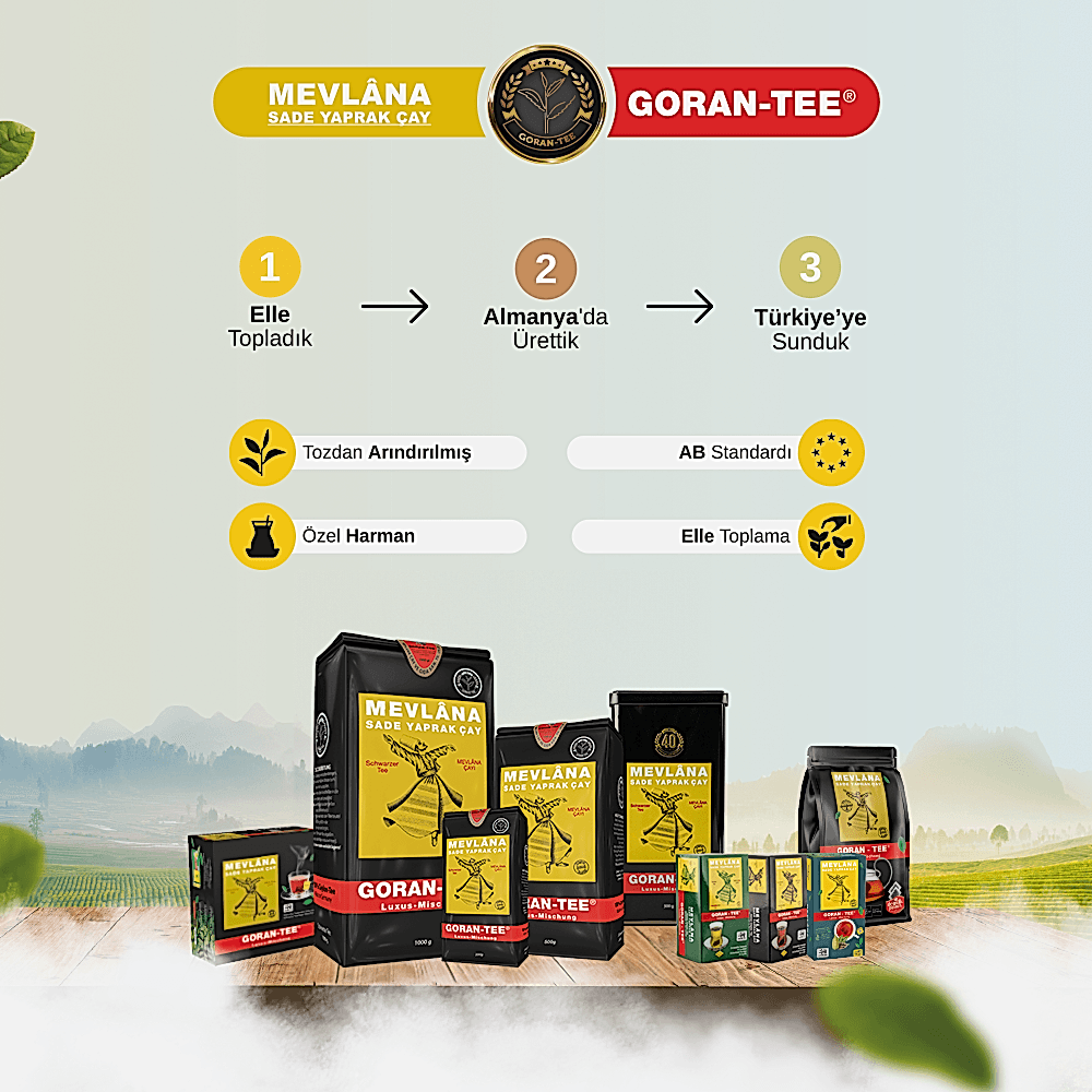 Goran Tee tarafından üretilen Mevlana Siyah Seylan Çayı, Doğu Asya’nın yüksek rakımlı çay bahçelerinden gelir. Büyük yapraklı çay yaprakları, Almanya’da en yüksek standartlara göre özenle elle toplanır ve işlenir. Bu dökme çayın olağanüstü kalitesi ve narin aroması, optimum yetiştirme yöntemlerine ve elverişli iklime dayanmaktadır.